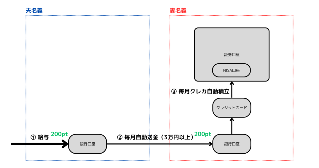 つまり、夫から専業主婦の妻名義の口座に毎月3万円以上振り込むと、妻名義の口座で毎月200ptもらえることになります。