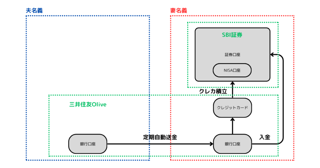 以上のように、SBI証券と三井住友Oliveを組み合わせ、夫の収入を妻の銀行口座に対して定額自動送金を行い、妻のクレジットカードで積立を行うことで、投資に関する知識はなくとも自動で資産運用が行えます。